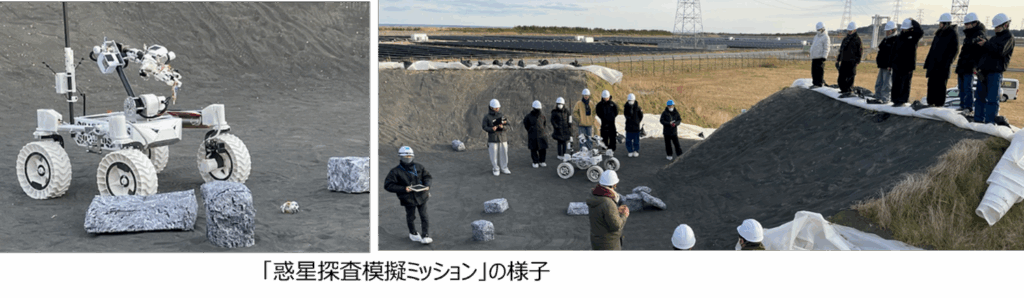 ■実施内容:火星探査ローバーを開発する学生団体のARES Project・会津大学・福島RTFの三者共同で、RTF内に会津大学が造成したクレーターエリアにて、惑星探査ミッションを模擬した実証実験を実施しました。会津大学・ARES・RTFそれぞれに役割を持たせた協調ミッションで、クレーター内を探査するとともにローバーの走行性能の確認を行いました。